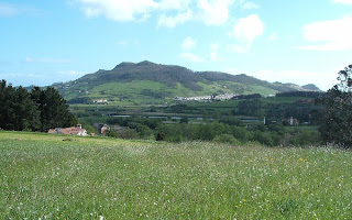 The long walk round to avoid crossing the raiway bridge. The boat looked inviting, but not the guard dogs! The bridge can be seen through the trees. The photo for the post of 28th April 'Boo to Santillana' was taken from the opposite side of the river.